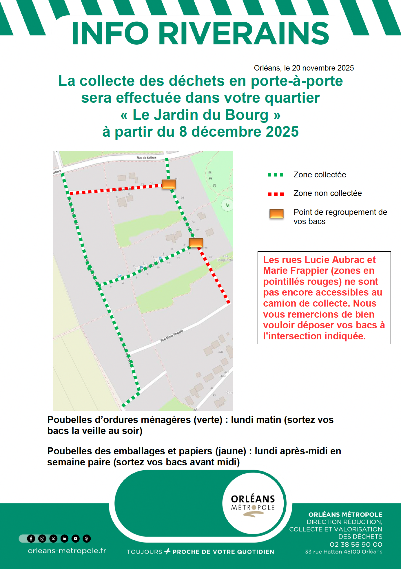 Ces rues ne sont pas encore accessibles au camion de collecte. Merci de déposer vos bacs au point de regroupement indiqué sur le plan.