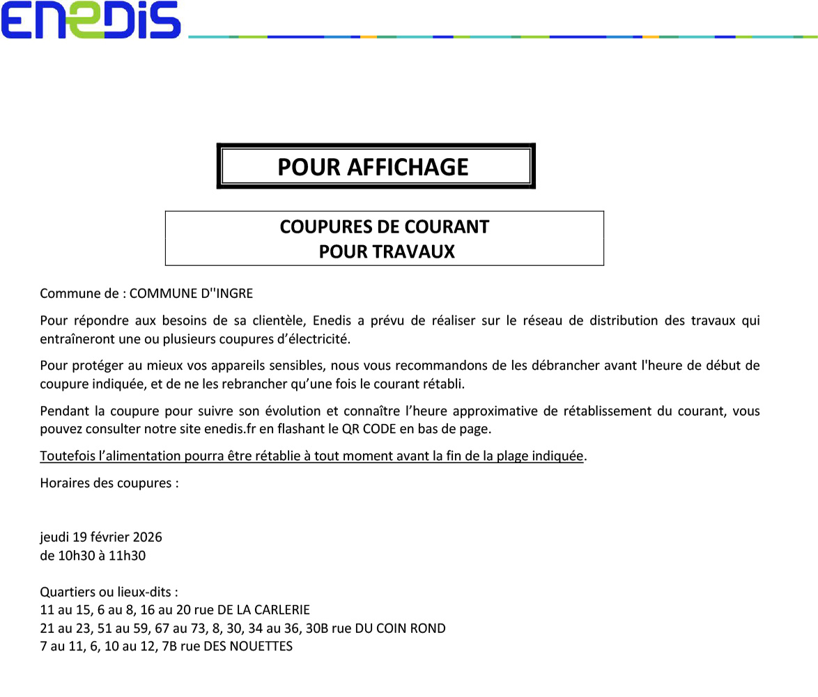Pendant la coupure pour suivre son évolution et connaître l’heure approximative de rétablissement du courant, vous pouvez consulter notre site enedis.fr en flashant le QR CODE en bas de page, ou télécharger l’application Enedis à mes côtés. Toutefois l’alimentation pourra être rétablie à tout moment avant la fin de la plage indiquée.