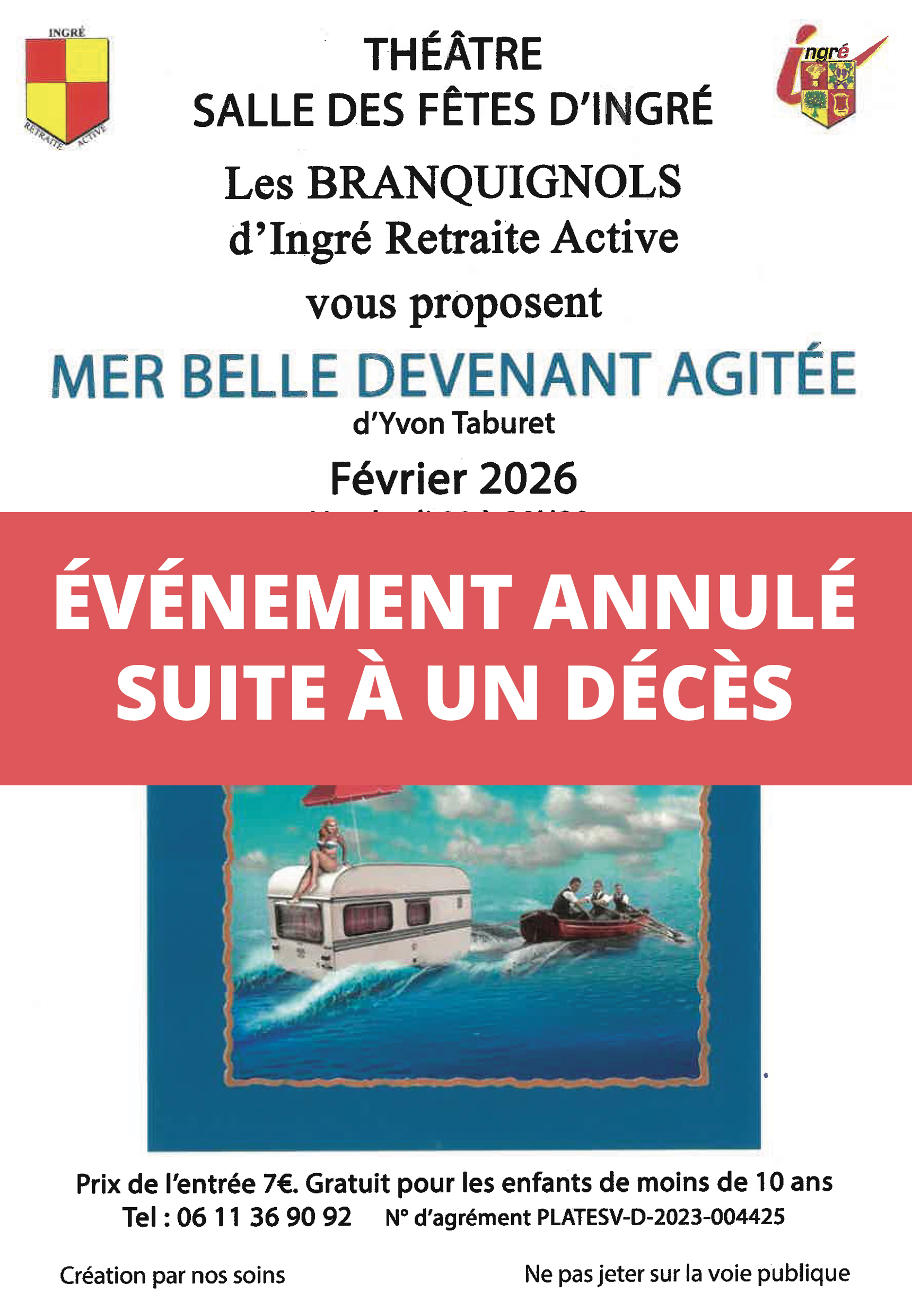 La troupe des Branquignols de l’association Ingré Retraite Active vous donne rendez-vous à la salle des fêtes Jean Zay. Représentations vendredi 20 février à 20h30, samedi 21 février à 14h30 et dimanche 22 février à 14h30.